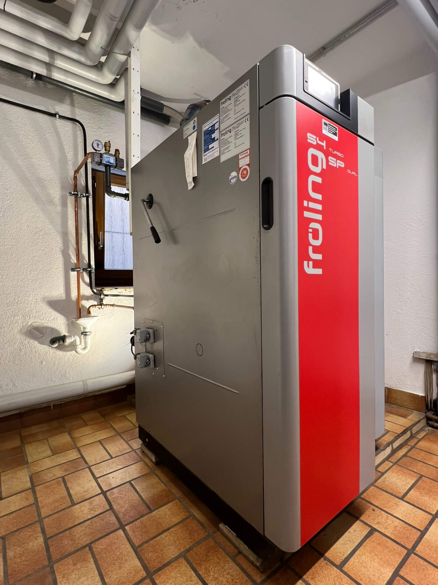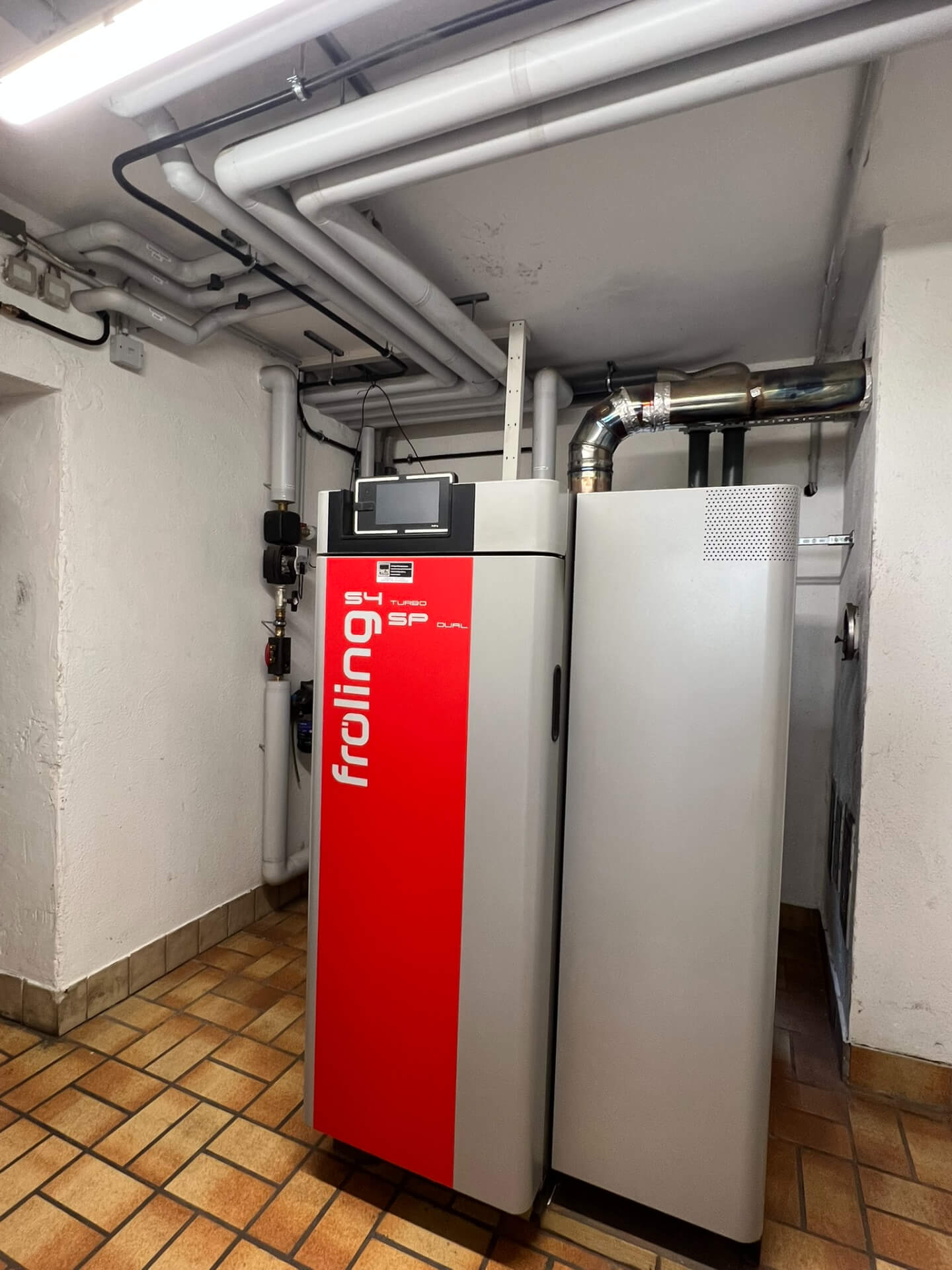 Das alte Ölheizungssystem von Viessmann wurde durch eine innovative Kombination aus Pellets und Scheitholz ersetzt. Das Herzstück bildet der Fröling Kombikessel SP Dual 28 kW mit 7‘‘ Touch, der beide Brennstoffe effizient nutzt.