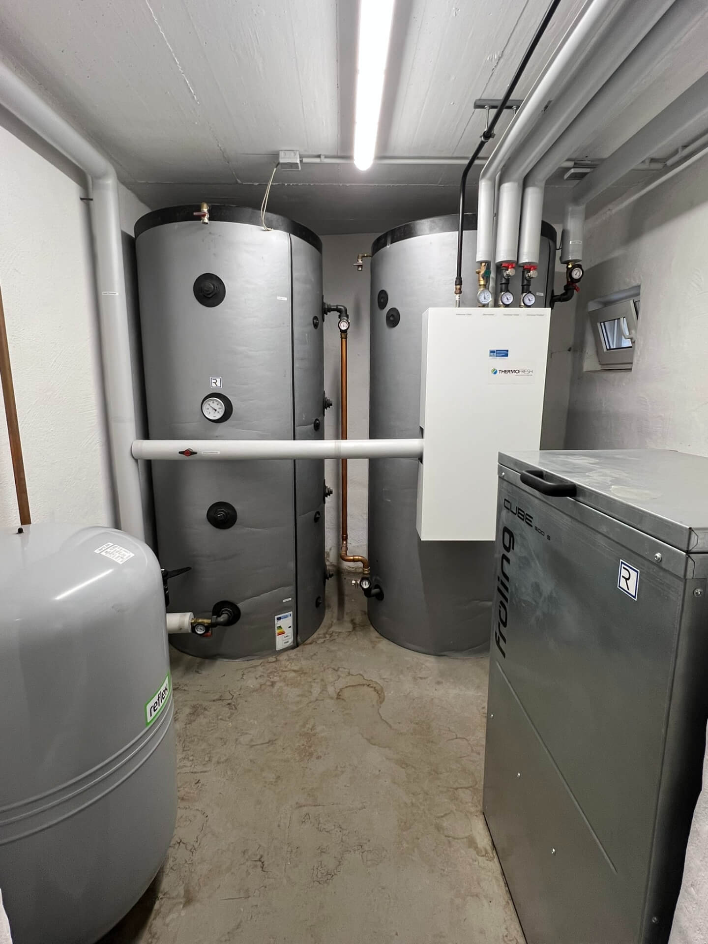 Ergänzt wird die Anlage durch den Fröling Pelletsvorratsbehälter Cube 500 S sowie zwei Thermosafe Schichtenspeicher à 1000 Liter inklusive Frischwasserstationen, die eine hygienische Warmwasserbereitung gewährleisten.